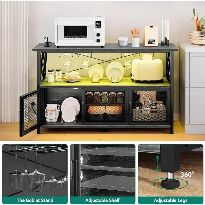 - LED-Lit Wine Bar Cabinet: Enhance your home with our bar cabinet featuring RGB LED light strips on top of the cabinets; Enjoy 7 vibrant colors and 8 modes, easily adjustable with the included remote control; Create a cozy and romantic atmosphere effortlessly